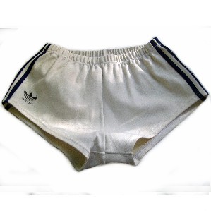 Silbernes Adidas Turnhöschen - selbst geschneidert Artikelbeschreibung - description Größe: 4 / medium Material: weichgewaschene Baumwolle / soft washed cotton fabric ohne Innenslip aber mit Kordel / without inner liner für 40 bei ebay im Mai 2001 gekauft |