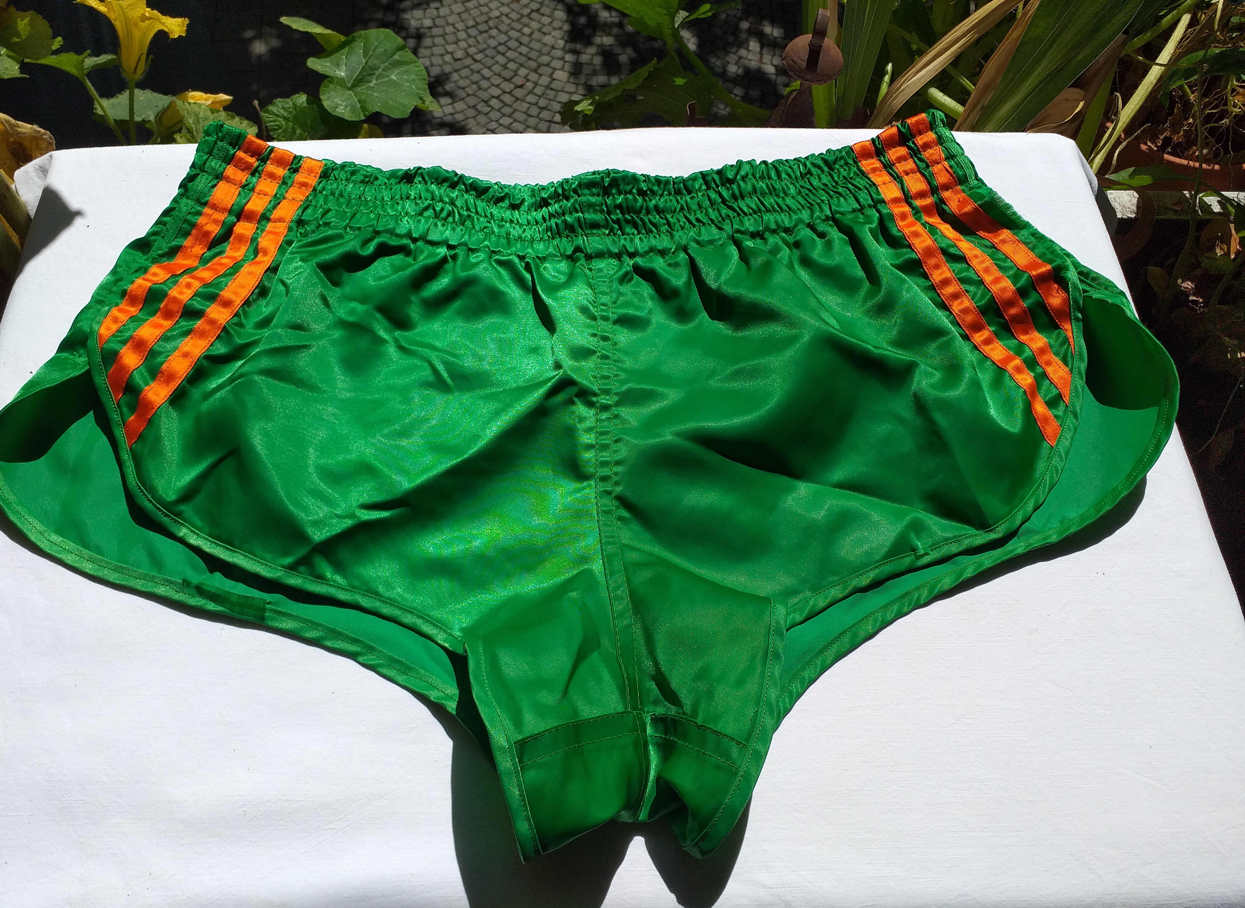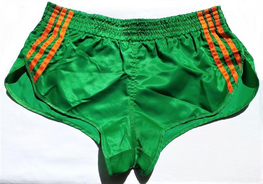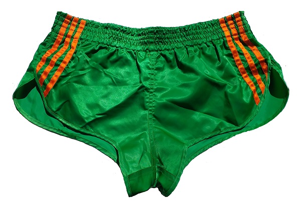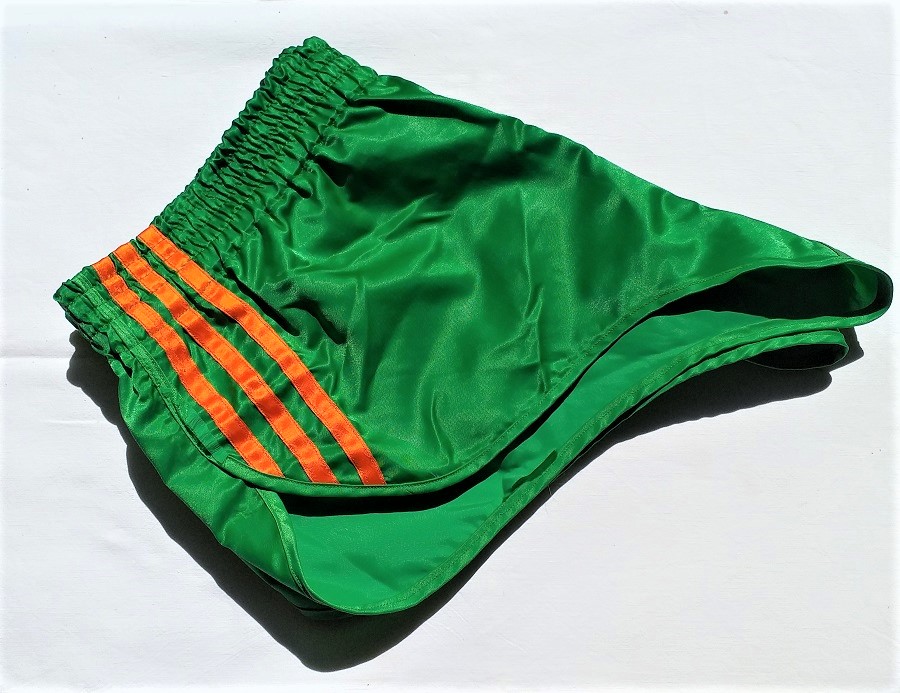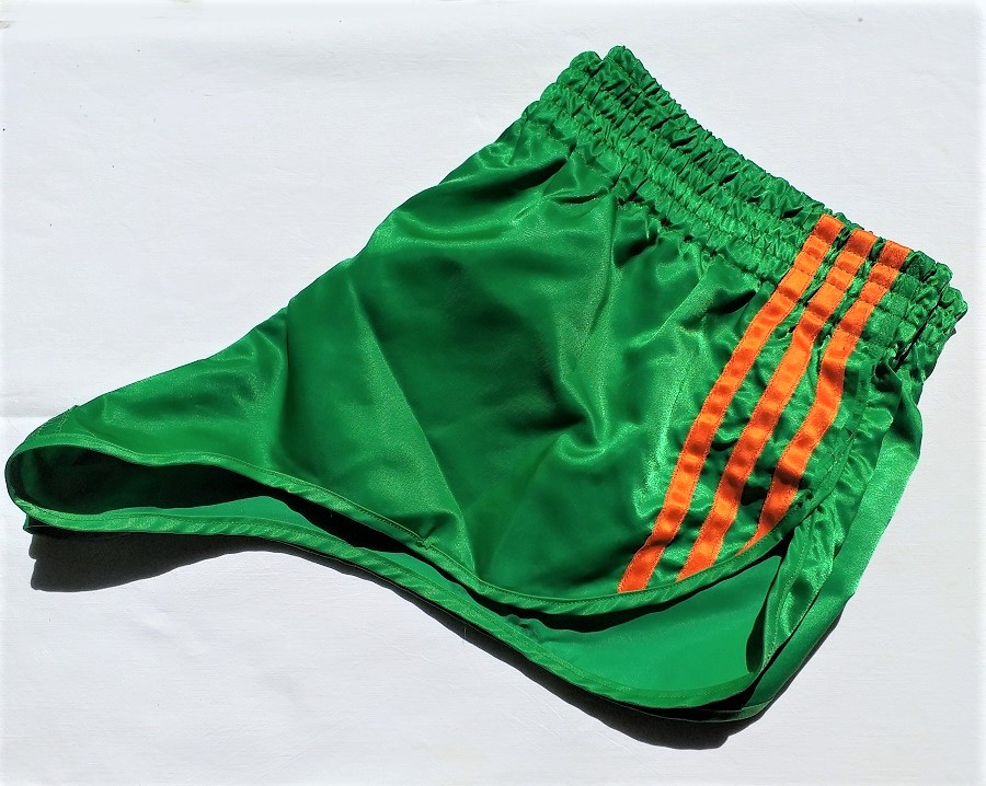 Grüne Adidas GlanzSprinter Shorts mit orangen Seitenstreifen