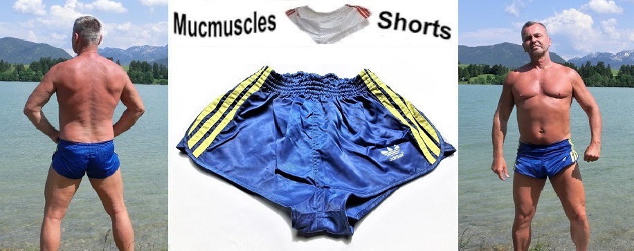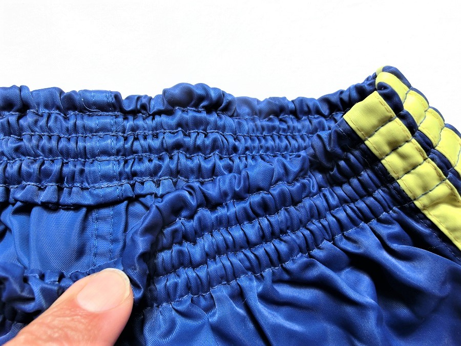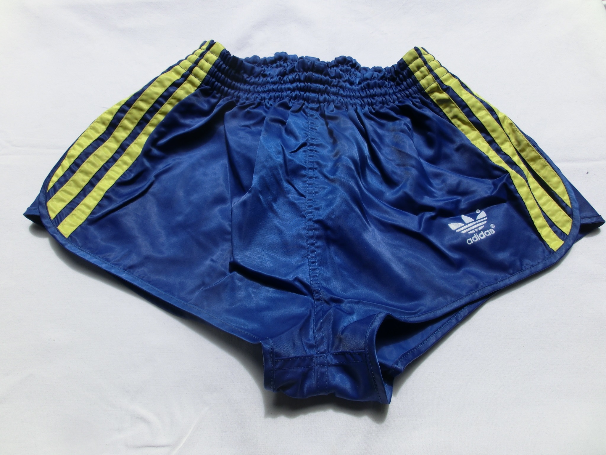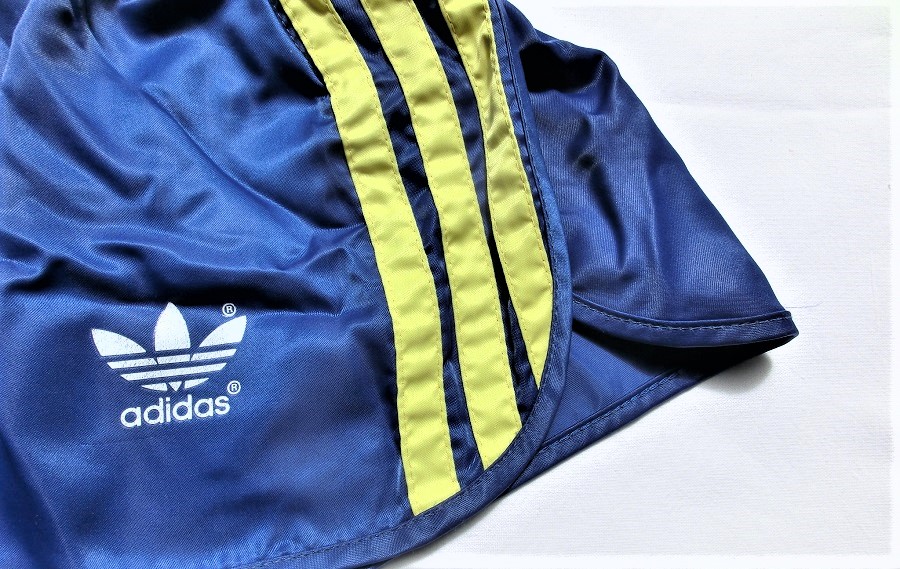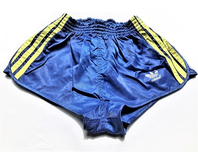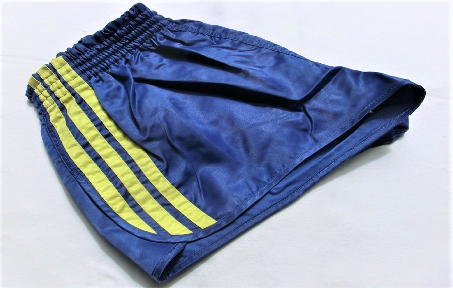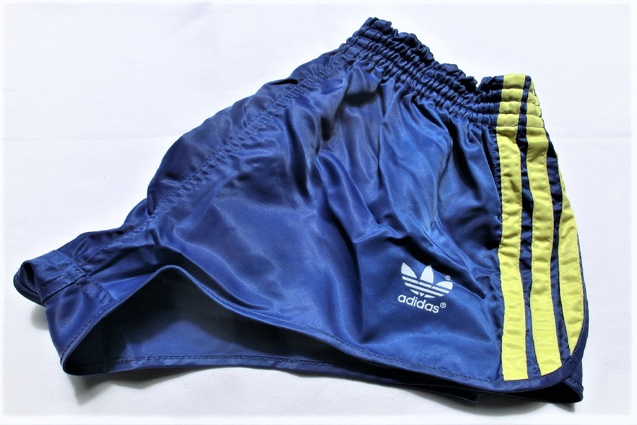 Blau-gelbe Adidas GlanzSprinter Shorts im 80er Stil